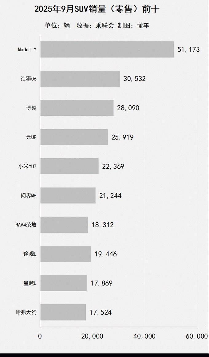 展望第四季度,榜单或将再次洗牌:Model Y改款谍照已出,后轮转向+4680电池,若年底上市,销量有望继续冲高;小米YU7产能释放后,月销3万不是梦;问界M8产能爬坡完成,或冲击前五;吉利星越L东方曜272马力+Flyme Auto上市,能否把燃油SUV拉回前十?合资方面,丰田RAV4 PHEV、本田HR-V e:HEV即将登场,但定价若高于16万,大概率仍难翻盘。