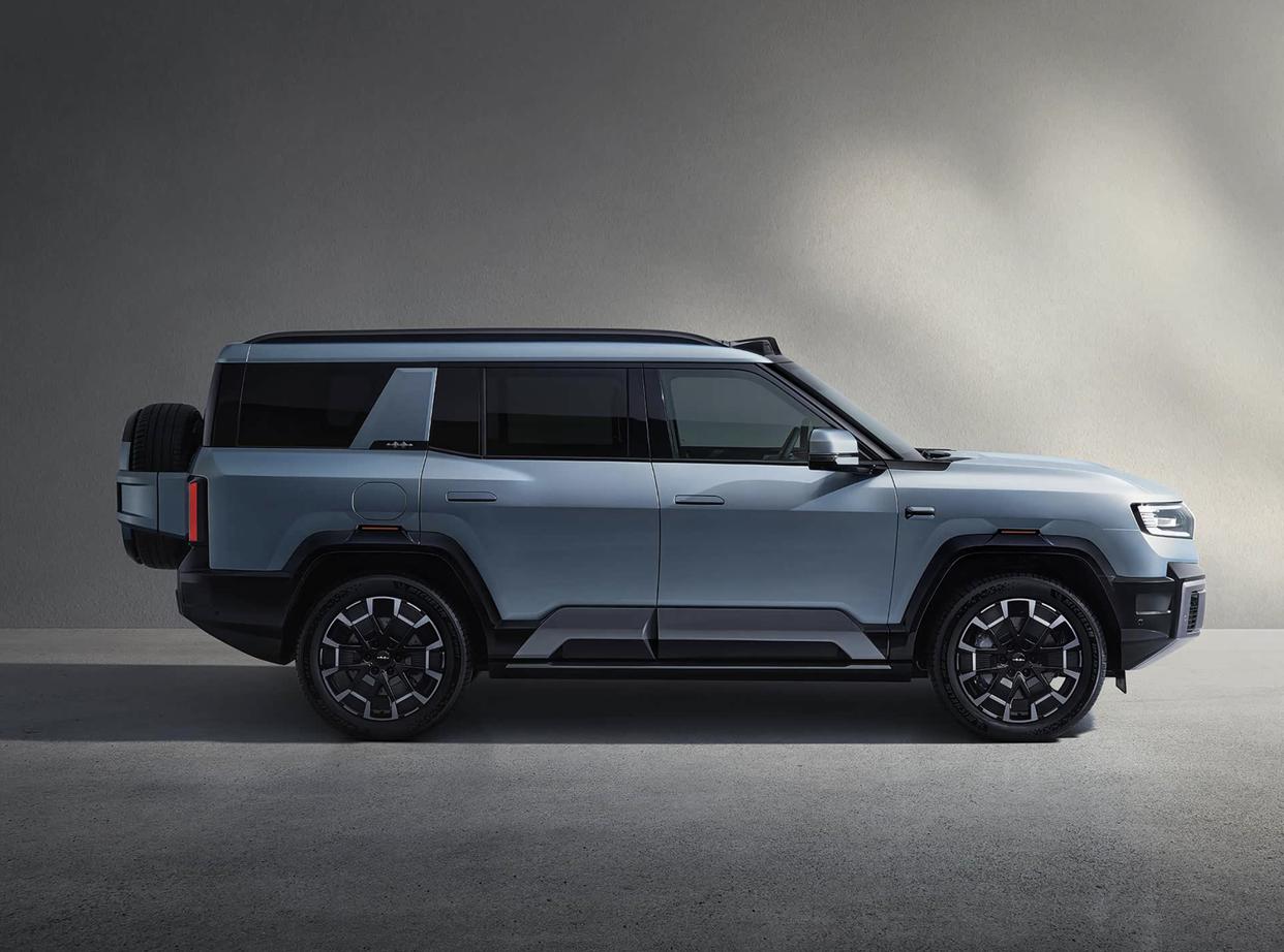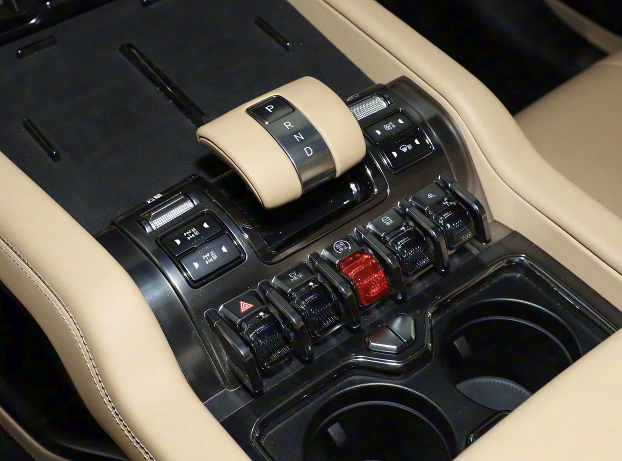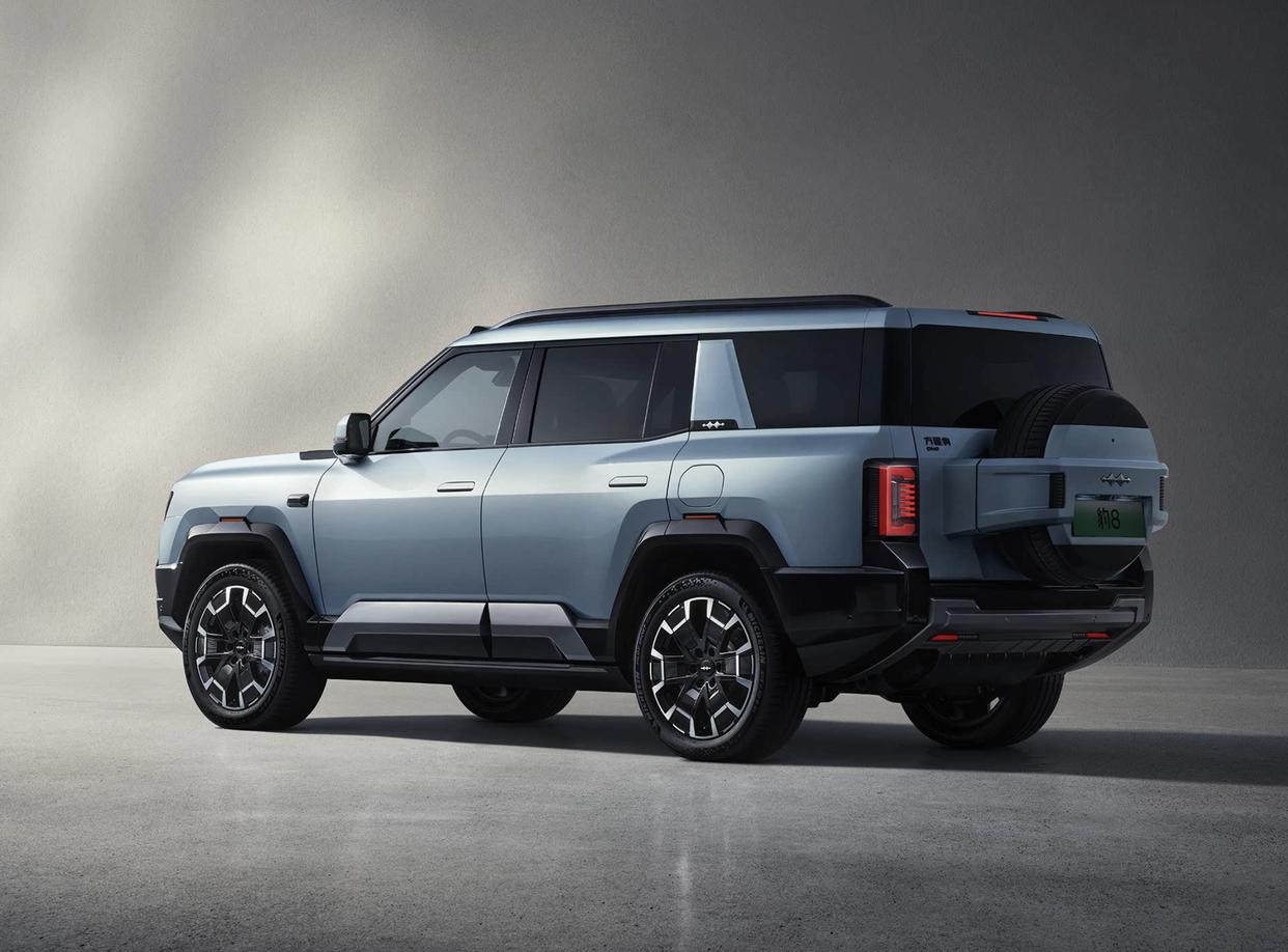 方程豹 豹8的车身采用了方盒子轮廓,大量平直的线条勾勒,造型十分复古,梯形的银灰色宽体侧裙的加入,也让整车更有力量感。20英寸的轮圈搭配着275/55 R20的轮胎,适用于日常城市道路及轻度越野场景。还可以升级为21英寸的轮圈(275/50 R21),适合复杂地形或高性能需求用户。车身尺寸方面,方程豹豹8的长宽高分别为5195/1994/1875(含车顶行李架1905)mm,轴距为2920mm。通过性方面,方程豹豹8的接近角30°~34°、离去角29~35°°,纵向通过角18°~26°,离地间隙220mm~310mm(云辇-P悬架调节最高情况)。该车新增了湖光绿车漆配色,显得更加与众不同。