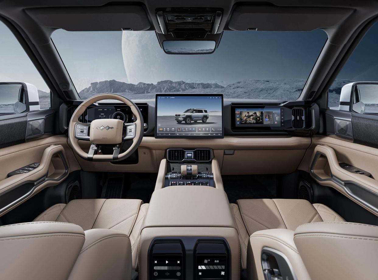 方程豹豹8还带来了5座车型版本,后排配备带腿托零重力座椅,配备了四向可调节腿托,再加上二排增加了100mm的腿部空间,纵向空间达到970mm,后排直接能跷二郎腿,提升二排乘坐体验。后排还配备了双开门的冰箱以及全液晶控制面板,再加上12.3英寸全液晶仪表+17.3英寸中控屏+12.3英寸副驾屏+50英寸AR-HUD的组合,带来了最直观的视觉冲击力,支持联动功能,内置DiLink 150系统,搭载了BYD 9000芯片,还支持“方华”手车互联,变得更加智慧,一键互联。用料和工艺也更加厚道,车内采用了大面积真皮材质和超纤皮材质的交替混搭,还加入了木纹拼接装饰,棚顶使用了麂皮材质,整体营造出了视觉与触觉双享受。